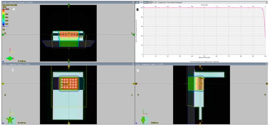 A representative scheme from planning 2 Gy irradiation of a 12-well plate using a modulated scanning technique. (A): transversal view, (B): dose-volume histogram, (C): coronal view, (D): sagittal view.