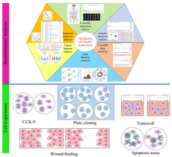 In this research (Figure 1), we utilized the GEPIA2, HPA, TCGA, and GTEx databases to examine the transcriptional and translational statuses of C10orf90. Using bioinformatic methods, we performed prognostic and diagnostic value analysis of the C10orf90 gene, analysis of gene copy number variation, and DNA methylation, among others. Furthermore, we performed various cell experiments, such as CCK-8, plate cloning, Transwell, wound-healing, and apoptosis assays, to clarify the possible function of the C10orf90 gene in inhibiting proliferation and migration in COAD cells. These experiments aimed to contribute additional data to elucidate the underlying biological mechanisms associated with the C10orf90 gene.