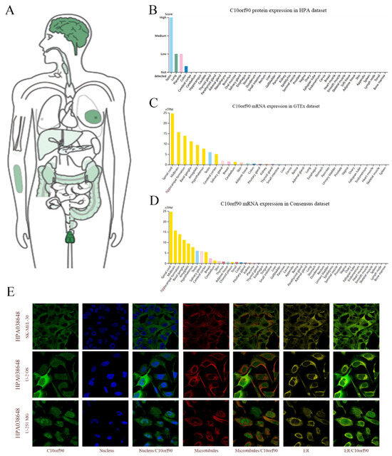 Utilizing the GEPIA2 and HPA databases, we performed a search for C10orf90 mRNA and protein expression. C10orf90 protein expression was detected in various organs and tissues, including the testis, brain, breast, forearm, colon, kidney, liver, and pancreas (Figure 2A). The findings from the HPA database indicate that the C10orf90 protein is predominantly expressed in the testis, lung, placenta, and colon (Figure 2B). The GTEx and Consensus dataset databases demonstrate that C10orf90 mRNA is mainly expressed in the spinal cord, brain, testis, salivary gland, breast, skin, adipose tissue, colon, and kidney (Figure 2C,D and Supplementary Table S1). Additionally, immunofluorescence localization of C10orf90 subcellular localization was obtained by staining the nucleus, microtubules, and endoplasmic reticulum in SK-MEL-30, U-2 OS, and U-251 MG cells. The results demonstrate that C10orf90 is primarily located in microtubules and cytoplasmic solutes (Figure 2E).