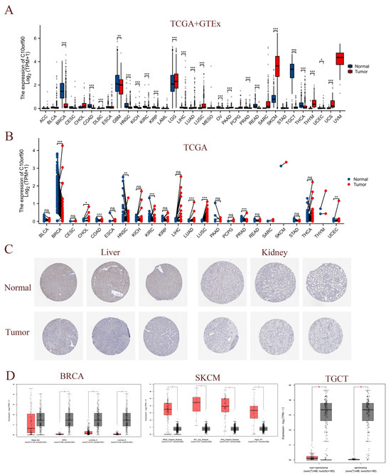 Expression of C10orf90 in various tumor tissues. (A) Expression of C10orf90 mRNA in TCGA + GTEx database. (B) Expression of C10orf90 mRNA in TCGA database. (C) In HPA data, the expression of C10orf90 protein is lower in liver cancer and kidney cancer compared to normal tissues (antibody HPA075229). (D) GEPIA2 database analysis of C10orf90 expression in different subtypes of BRCA, SKCM, and TGCT. (* p < 0.05, ** p < 0.01, *** p < 0.001).