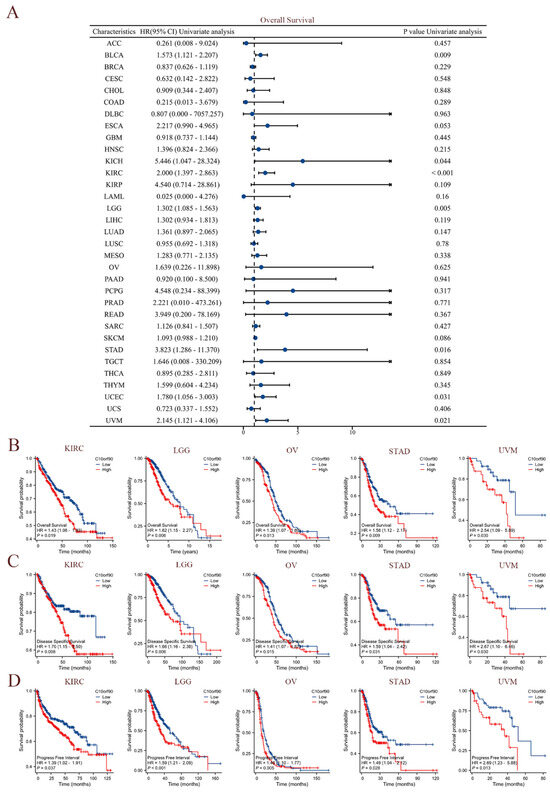 Prognostic correlation of C10orf90 expression in multiple tumors. (A) The expression C10orf90 is associated with overall survival. (B) Overall survival K-M curves of C10orf90 expression in KIRC, LGG, OV, STAD, and UVM patients. (C) Disease-specific survival K-M curves of C10orf90 expression in KIRC, LGG, OV, STAD, and UVM patients. (D) Progression-free interval K-M curves of C10orf90 expression in KIRC, LGG, OV, STAD, and UVM patients.