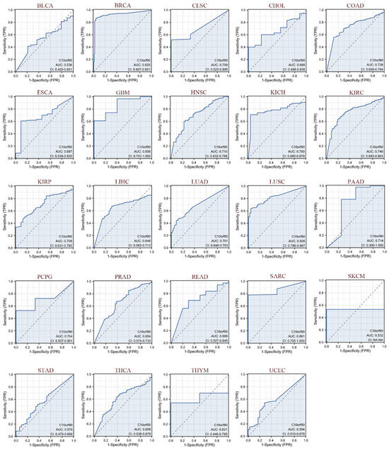 ROC curves of C10orf90 in multiple cancers. Cancers with AUC > 0.5 include BLCA, BRCA, CESC, CHOL, COAD, ESCA, GBM, HNSC, KICH, KIRC, KIRP, LIHC, LUAD, LUSC, PAAD, PCPG, PRAD, READ, SARC, SKCM, STAD, THCA, THYM, and UCEC. (Blue curve is the ROC curve and the dotted line is the baseline).