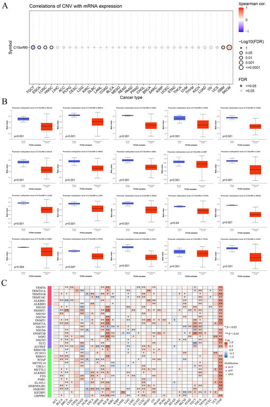 Association between C10orf90 expression and CNV and gene methylation. (A) Correlation between CNV and C10orf90 expression in GSCA database. (B) Promoter methylation levels of C10orf90 in 20 cancers from UALCAN. (C) Correlation analysis of C10orf90 expression with mRNA modification methylation regulators.