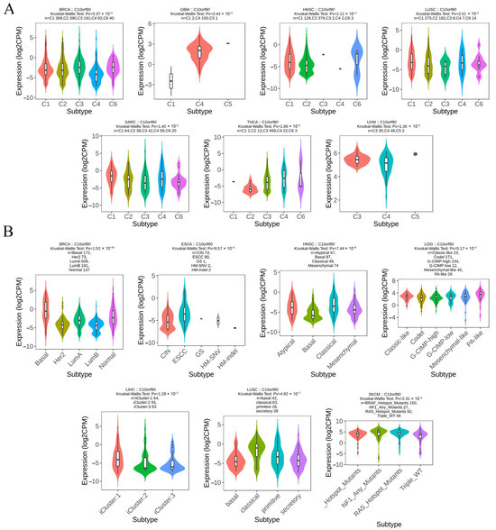 We utilized the “Subtype” module within the TISIDB database (http://cis.hku.hk/TISIDB/ accessed on 2 June 2024) to investigate the expression patterns of C10orf90 across different immune and molecular subtypes present in various tumor types [40], such as C1 (wound healing), C2 (IFN-γ dominant), C3 (inflammatory), C4 (lymphocyte depleted), C5 (immune quiescent), and C6 (TGF-β dominant).