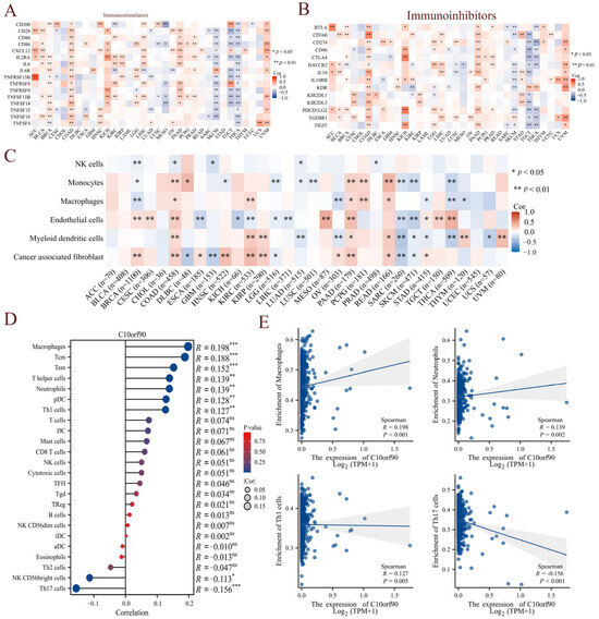 Given the presence of immune cell infiltration in the tumor microenvironment, which is closely linked to the efficacy of immunotherapy, we initially investigated the correlation between C10orf90 and genes identified as immune checkpoint genes. The results demonstrated that among the immunostimulators, C10orf90 exhibited a positive correlation with the immunostimulators in tumors such as COAD, PAAD, and UVM, and a negative correlation with SKCM, TGCT, and THCA cancers (Figure 8A and Supplementary Table S5). Conversely, C10orf90 demonstrated a similar pattern of correlation with immunoinhibitors in tumors such as COAD, PAAD, and UVM, with a negative correlation observed in SKCM, TGCT, and THCA cancers (Figure 8B and Supplementary Table S6). Subsequently, the correlation between C10orf90 expression in pan-cancer and the degree of tumor-infiltrating immune cells was validated using the TIMER database. The correlation coefficients of six tumor-infiltrating immune cells (NK cells, monocytes, macrophages, endothelial cells, myeloid dendritic cells, and cancer-associated fibroblasts) were collected and presented in a heatmap format (Figure 8C). The most pronounced correlation between C10orf90 expression levels and immune cell infiltration was observed in COAD, followed by BRCA and PAAD. Given the strongest association identified between C10orf90 and immune infiltration in COAD, our analysis focused on exploring the relationship between C10orf90 and 24 different subtypes of immune cells in COAD as a case study. The expression of the C10orf90 gene was found to be positively correlated with the presence of macrophages, Tcm, Tem, T helper cells, neutrophils, pDC, and Th1 cells. Conversely, it is negatively correlated with the presence of NK CD56 bright cells and Th17 cells (Figure 8D,E). These findings indicate that C10orf90 has the potential to influence the immune response by regulating genes related to immune modulation and the presence of immune infiltrating cells within tumors. This impact appears to be particularly significant in the context of COAD, as the extent of immune cell infiltration has been associated with the level of C10orf90 expression.