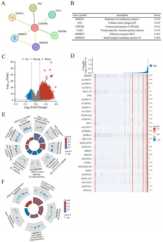 PPI network and gene function enrichment analysis of C10orf90. (A) The C10orf90 protein interacts with a PPI network. (B) The PPI network co-expression score. (C) A volcano plot of significantly correlated genes with C10orf90 in COAD is presented. (D) Heatmap of the top 30 genes positively associated with the C10orf90 gene in COAD. (E) GO enrichment analysis. (F) KEGG enrichment analysis. (* p < 0.05, ** p < 0.01, *** p < 0.001).