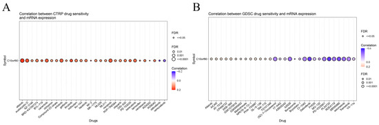 Sensitivity analysis of C10orf90 related drugs. (A) Relationship between C10orf90 and CTRP drug sensitivity. (B) Relationship between C10orf90 and GDSC drug sensitivity.