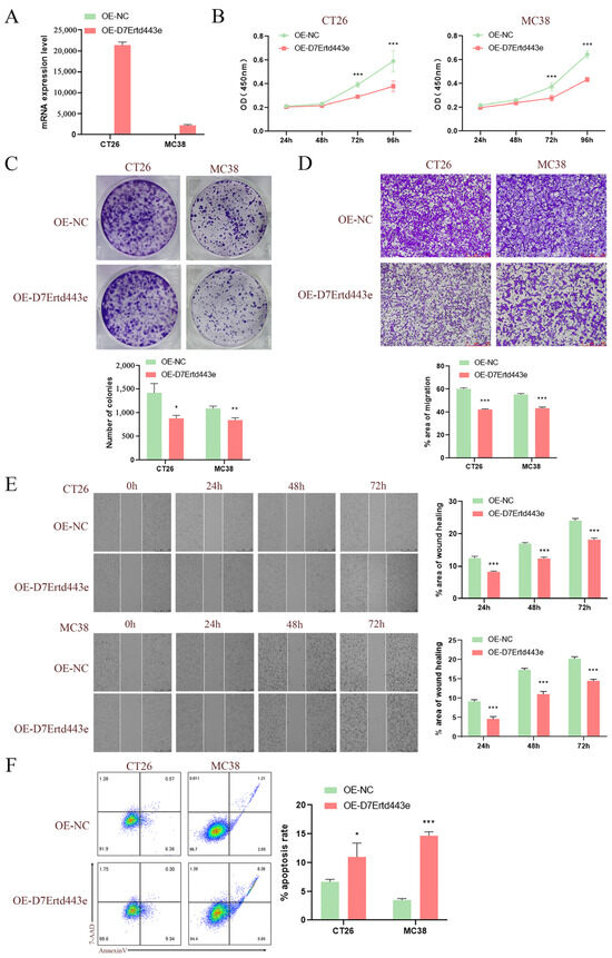 CT26 and MC38 cells infected with OE-D7Ertd443e and OE-NC were inoculated with 1 × 106 cells in 6-well plates and cultured overnight. Parallel scratches were made on the cell layer with a 200 μL lance tip, washed three times with PBS buffer, and photographed at 0 h, 24 h, 48 h, and 72 h to observe changes in scratch width.