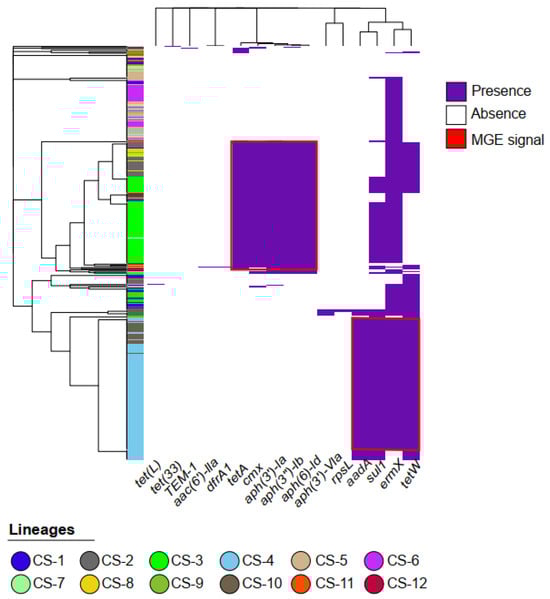 Phylogenetic and population structure analyses further revealed that C. striatum has 12 lineages (Figure 2), with CS-3 and CS-4 being the most important in terms of AMR gene storage. The CS-3 lineage, present in 83 genomes, shows resistance genes such as tetA, cmx, aph(3′)-Ia, aph(3″)-Ib, and aph(6)-Id. Meanwhile, the CS-4 lineage is present in 110 genomes and possesses the resistance genes aadA, sul1, ErmX, and tet(W). These two lineages are the most abundant in C. striatum genomes and harbor the highest number of AMR genes, which may be because they are carried by mobile genetic elements (MGEs).