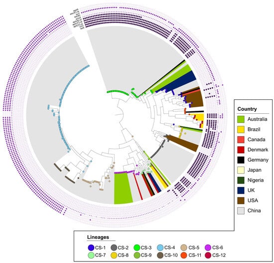 The branching structure of the tree (Figure 2) is evidence of genetic diversity within C. striatum. Multiple lineages (CS-1 to CS-12) were identified, some showing close genetic relatedness, while others diverged significantly. In addition, it was observed that lineages can spread geographically between different countries, such as the CS-1 lineage, found in China (5 genomes), the United States (12 genomes), the United Kingdom (7 genomes), Canada (1 genome), and Germany (1 genome), or CS-2, present in the United States (5 genomes) and China (25 genomes). There are also local or endemic lineages, such as CS-12 in Brazil, and lineages CS-2, CS-3, CS-4, and CS-5 in regions of China. In addition, some lineages, such as CS-2, CS-3, CS-4, and CS-6, are clonal and endemic. These findings indicate that C. striatum has a “mixed population structure”, exhibiting simultaneously cosmopolitan, endemic, and potentially epidemic characteristics.