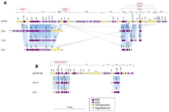 Comparison of plasmid sequences with C. striatum lineages. (A) Plasmid pTP10 is distinguished by modules in dark purple, which represent AMR genes. The regions where transposons are located in the plasmid are represented with red letters above the modules. The genomes belonging to each lineage CS-2, CS-8, and CS-3 are aligned in blue horizontal lines, which demonstrate the regions and genes they share. (B) The plasmid pJA144188, comprising five modules, has been aligned with the lineages CS-10 and CS-4. Module V contains a class 1 integron that is shared with the lineages, in addition to the resistance gene tet(W) in module III.