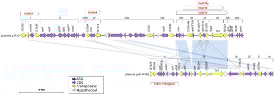 The plasmid pJA144188, originally characterized in C. resistens by Schröder in 2012 [], was subjected to comprehensive analysis, resulting in the identification of its five functional modules and the six resistance genes it harbors. A comparison of the structural and functional characteristics of the pJA144188 plasmid with those of the pTP10 plasmid from C. striatum (Figure 4) revealed that module IV of pJA144188 shares several regions with pTP10, including the cmx resistance gene. Additionally, a substantial number of genes present in modules ranging from the regions of module IVa to IVb of pTP10 that are aligned with genes from module IV in plasmid pJA144188 also carry three transposons belonging to pTP10: Tn5716, Tn5715, and Tn517. This finding suggests that recombination or gene transfer events may have occurred between these plasmids. Additionally, it was identified that module V of pJA144188 corresponds to a class 1 integron carrying the resistance genes sul1, aadA, and aac(6′)-Ia, which are known to play a role in the distribution and propagation of antimicrobial resistance [].