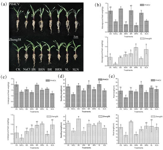Phenotypes of seedlings under different treatments. (a) Effects of exogenous hormones on the morphology of maize seedlings under salt stress. (b) Aboveground fresh weight. (c) Underground fresh weight. (d) Seeding length. (e) Root length. Different lowercase letters represent significant differences between treatments by Tukey’s test (p < 0.05).