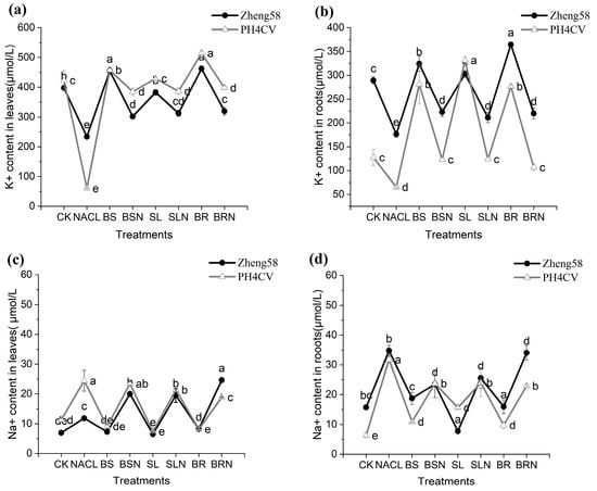 Comparison of Na and K contents in roots and leaves in Zheng58 and PH4CV. (a) K+ content in leaves. (b) K+ content in roots. (c) Na+ content in leaves. (d) Na+ content in roots. Different letters represent significant within group.