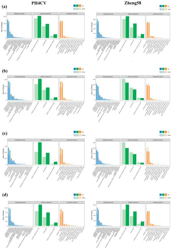 The GO function analysis of differentially expressed genes in two inbred lines under salt stress was divided into three parts: biological process (BP), cellular component (CC), and molecular function (MF). The results showed that in the CK vs. N control group, DEGs were mainly enriched in the cellular process and metabolic process; in BP, the metabolic process was mainly enriched in cellular anatomical entity and intracellular region; and in MF, DEGs were mainly enriched in catalytic activity and binding. Among them, the salt-tolerant genotype Zheng58 has more DEGs (Figure 4a) in these three components than the salt-sensitive genotype PH4CV. Therefore, it is postulated that the variances in the expression of these genes could potentially underlie the disparities in salt tolerance levels between the two inbred lines. In the BR vs. BRN, SL vs. SLN, and BS vs. BSN, the GO functional enrichment terms of the two inbred lines were the same as those of the CK vs. N, but after the exogenous application of BR and SL, the number of up-regulated genes in PH4CV was greater than that in Zheng58 (Figure 4b,c). This indicates that PH4CV is more sensitive to exogenous hormones. In BS vs. BSN (Figure 4d), compared with PH4CV, Zheng58 had a higher number of DEGs in the same enrichment term. It is supposed that BS can mobilize more genes to relieve salt stress.