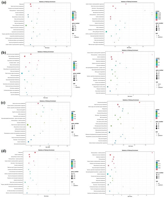 Scatter plot of KEGG enrichment. The horizontal axis represents the ratio of the number of differentially expressed genes annotated to the KEGG pathway to the total number of differentially expressed genes, and the vertical axis represents the KEGG pathway to the total number of differentially expressed genes, representing the KEGG pathway. The size of the points represents the number of genes annotated to the KEGG pathway. The color ranges from red to purple, representing the significance of the enrichment. (a) CK vs. NaCl; (b) BR vs. BRN; (c) SL vs. SLN; (d) BS vs. BSN.