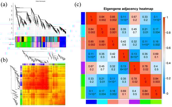Heat map and cluster analysis of the gene co-expression network. (a) Gene co-expression module construction. (b) Gene co-expression module heat map. (c) Inter-module correlation heat map.