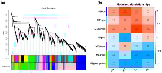 Correlation analysis between modules and phenotypic characteristics. (a) Systematic tree map and correlation heat map of genes. (b) Heat map of module and character correlation.