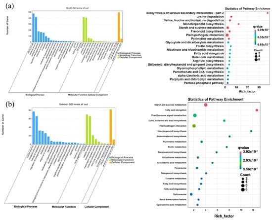 GO and KEGG analyses of genes within the blue module and salmon-colored modules with high correlation coefficient are shown in Figure 8. The biological processes were the metabolic process, single organism process, cellular process, and biological regulation. The cellular components were fine cells, organelles, cellular parts, and membrane components, and molecular functions were binding, catalytic activity, transport activity, and nucleic acid binding transcriptional factor activity. KEGG annotation showed that the genes in the blue module were mainly enriched in the biosynthesis of various secondary metabolites—part 2, lysine degradation, and valine, and the genes in leucine and isoleucine degradation were monoterpenoid biosynthesis, starch and sucrose metabolism, lavonoid biosynthesis, plant–pathogen interaction, and pyrimidine metabolism; the salmon-colored module was significantly enriched in starch and sucrose metabolism and fatty acid elongation.