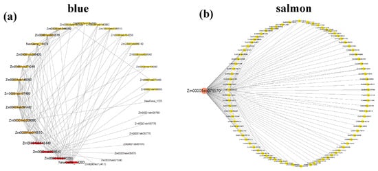 In order to mine Hub genes related to traits, cytoscape software_v3.10.0 [] was used to visualize the co-expression network of a single co-expression module. In this study, the top 100 genes (including duplicates) weighted by blue- and salmon-colored modules were visualized and analyzed by gene connectivity analysis (Figure 9). The core genes of the blue module mainly included Zm00001eb060200, Zm00001eb324540, and Zm00001eb043440. The main core gene of the salmon-colored module was Zm00001eb408430. The gene annotations were as follows: probable glutamate carboxypeptidase VP8, protein phosphatase 2C 1, cytochrome b5, and amino acid permease 3. Respective KOG notes concern inorganic ion transport and metabolism, signal transduction mechanisms, energy production, and conversion, as well as amino acid transport and metabolism (Table S2).
