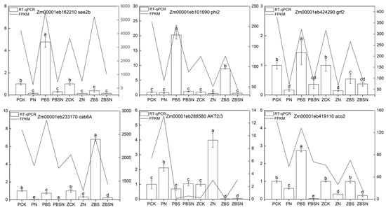 Validation of eight randomly selected genes by quantitative real-time PCR (RT-qPCR). The mRNA expression levels were normalized to the expression level of ACTIN, and the means from three biological replicates are shown. Bar charts and line charts represent RT-qPCR and RNA-Seq data, respectively. Different letters represent significant within group.