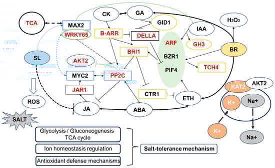 BR reduces the negative effects of salt stress on plant molecular processes and biochemical mechanisms, thus enhancing the salt tolerance of plants []. For example, the overexpression of the BR signaling kinase gene ZmBSK1 (Brassinosteroid SIGNALING KINASE 1) in maize has been demonstrated to enhance tolerance to elevated salt concentrations []. In contrast, Arabidopsis mutants lacking the gene responsible for the biosynthesis of BRs exhibited a greater susceptibility to salt stress conditions []. However, this phenotype could be rescued by exogenous application of BRs. In terms of interaction, the BRs co-receptor BAK1 (BRI1-associated receptor kinase1) has been observed to interact with the ABA signaling molecule ABI1, ultimately inhibiting stomatal closure []. The BZR1 (brassinazole-resistant 1) gene was identified as a regulator of GA biosynthesis and production in apple [] and carrot []. This resulted in the conferral of salt tolerance and petiole cell elongation in plants. The BR signaling pathway does not function in isolation within plants, and how BRs interact with other exogenous hormone pathways to affect plant growth and development and regulate plant response to stress needs further study.