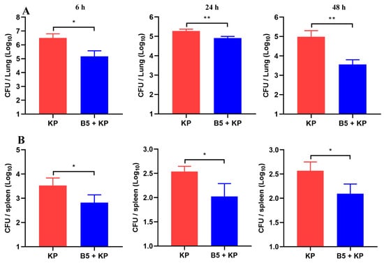 To determine the bactericidal activity of B5 in vitro, 0–1.28 mg/mL of B5 was incubated with 105 CFU/mL of K. pneumoniae suspension for 2 h, 4 h, and 6 h at 37 °C, and results showed that B5 failed to kill K. pneumoniae (Supplemental Figure S1). To investigate the protection provided by B5 against K. pneumoniae in vivo, B5-pretreated mice were challenged with K. pneumoniae and euthanized at 6 h, 24 h and 48 h after challenge. Our results showed that K. pneumoniae challenge led to the loss of body weight and the enlargement of the spleen and lungs; however, B5 significantly alleviated K. pneumoniae-caused body weight loss and organ enlargement (Figure 1A,D). Consistently, B5 significantly decreased the K. pneumoniae-caused increase in the lung and spleen weight (Figure 1B,C). Furthermore, B5 significantly reduced the bacterial load in the lungs and spleen in both the early and later stages of K. pneumoniae infection (Figure 2A,B). Collectively, these results suggest that B5 provides protection against K. pneumoniae.