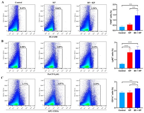 The mononuclear phagocyte system plays an important role in the innate immune response, which possesses phagocytic function and coordinates antibacterial immune response. Neutrophils and macrophages are important phagocytes. Neutrophils are the effector cells that are first present at the infection sites. To further investigate the effects of B5 on innate immune cells, neutrophils, macrophages, and dendritic cells in lung tissues were determined at 4 h after K. pneumoniae challenge. Results showed that K. pneumoniae infection significantly increased the number of neutrophils in the lungs compared with the control group, but did not affect macrophages and dendritic cells, suggesting that neutrophils were the first to reach the site of infection (Figure 4A–C). When compared to the KP group, B5 significantly increased the percentage of macrophages and dendritic cells in the lungs, but there was no significant difference in neutrophils between both groups (Figure 4A–C). Overall, these results reveal that B5 enhances the recruitment of macrophages and dendritic cells into the lungs in the early infection stage.