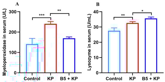 B5 regulates levels of myeloperoxidase and lysozyme in serum in later infection phase. Serum samples were collected at 24 h after challenge. (A) The level of myeloperoxidase in serum. (B) The level of lysozyme in serum. Data shown are means ± SD. Data are representative of two independent experiments (n = 3). Statistical analysis was performed by ANOVA followed by Tukey’s multiple comparison test (* p < 0.033, ** p < 0.0021, *** p < 0.0002).