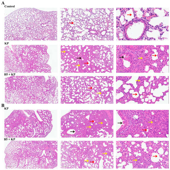 B5 alleviates inflammatory damage in lungs. (A) Histopathological images of lungs at 24 h after challenge. (B) Histopathological images of lungs at 48 h after challenge. Left images at ×40 magnification (scale bar, 500 μm); middle images at ×100 magnification (scale bar, 200 μm); right images at ×400 magnification (scale bar, 50 μm). Red arrows represent alveoli, black arrows represent fallen bronchial epithelial cells, and yellow arrows represent inflammatory cells in pulmonary interstitium. Data are representative of two independent experiments (n = 3 mice per group).