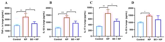 Pro-inflammatory cytokines were crucial for restricting K. pneumoniae in the early infection phase, but excessive inflammatory response causes pathological damage []. To further investigate the effects of B5 on inflammatory response, cytokines in lung tissues were measured 24 h after K. pneumoniae challenge. As shown in Figure 7, K. pneumoniae challenge led to a significant increase in the production of TNF-α, IL-1β, IL-22, and IL-17 in the lungs compared with the uninfected control, suggesting that obvious inflammatory response occurred in the lungs, which was in line with the pathological changes in the lungs. In comparison with the K. pneumoniae group, B5 pretreatment significantly inhibited the production of TNF-α, IL-1β, and IL-17 and mildly inhibited the secretion of IL-22, but no significant difference in IL-22 between the KP group and the B5 + KP group was observed (Figure 7A–D). These results reveal that B5 suppresses the excessive secretion of TNF-α, IL-1β, and IL-17 in the later infection phase.