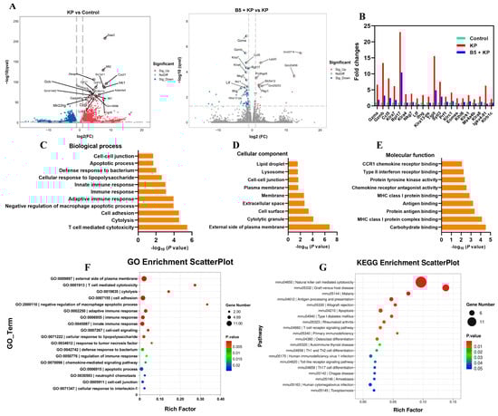 Gene Ontology (GO) term and Kyoto Encyclopedia of Genes and Genomes (KEGG) pathway analysis of differentially expressed genes. (A) Differentially expressed genes are shown in volcano plots. (B) Fold changes in representative differentially expressed genes. (C–E) Gene enrichment in biological process (C), cellular component (D), and molecular function (E). (F) GO enrichment scatterplot. (G) KEGG enrichment scatterplot.
