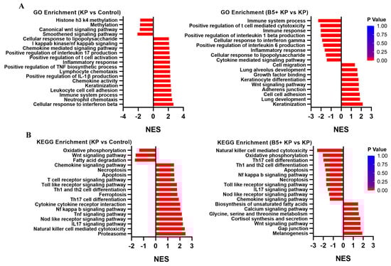 To explore the effects of B5 on the gene expression profiles in the lungs, the lungs were collected at 6 h after challenge, and the RNA-seq experiments were carried out. Results showed that K. pneumoniae infection significantly up-regulated 2112 genes (fold change, FC > 2) and significantly down-regulated 3503 genes (FC < 0.5) compared with the uninfected control. Moreover, 16 genes were significantly up-regulated and 54 genes were significantly down-regulated in the B5 + KP group compared with the KP group (Figure 8A). When compared to the control group, K. pneumoniae infection induced the overexpression of genes (Gzma, Gzmb, Ccl5, Klra7, Rpl17, etc.) mainly associated with natural killer (NK) cell-mediated cytotoxicity, but B5 significantly inhibited the expression of these genes (Figure 8B), suggesting that B5 may improve the cytotoxicity mediated by the excessive activation of NK cells caused by K. pneumoniae. Next, GO analysis showed that in the B5 + KP group and KP group, genes were mainly enriched in T cell-mediated cytotoxicity, defense response to bacterium, immune response, cellular response to lipopolysaccharide, etc. in the biological process, enriched in the external side of plasma membrane, cytolytic granule, cell surface, etc. in the cellular component, and enriched in carbohydrate binding, MHC class I protein complex binding, CCR1 chemokine receptor binding, etc. in the molecular function (Figure 8C–F). Moreover, KEGG analysis showed that genes were mainly enriched in NK cell-mediated cytotoxicity, antigen processing and presentation, Th1 and Th2 cell differentiation, Th17 cell differentiation, Toll-like receptor signaling pathway, and T cell receptor signaling pathway in the B5 + KP group and KP group (Figure 8G). Furthermore, gene set enrichment analysis (GSEA) showed that K. pneumoniae infection activated cellular response to interferon beta, immune system process, positive regulation of IL-1β production, inflammatory response, etc. compared with the uninfected control; however, B5 obviously inhibited these responses and enhanced responses associated with lung development, lung alveolus development, growth factor binding, etc. compared with the K. pneumoniae control, suggesting that B5 regulated K. pneumoniae-induced inflammatory response and enhanced repair response in the lungs (Figure 9A). Consistently, K. pneumoniae activated signaling pathways related to NK cell-mediated cytotoxicity, IL-17 signaling pathway, Th17 cell differentiation, apoptosis, necroptosis, and NF-κB signaling pathway in comparison with the uninfected control, but B5 pretreatment inhibited these signaling pathways compared with the K. pneumoniae infection control (Figure 9B). Collectively, these results suggest that B5 ameliorates the excessive inflammatory response caused by K. pneumoniae.