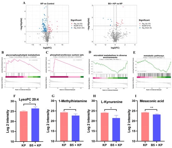 To investigate the effects of B5 on the metabolic response in the lungs, the lungs were collected at 6 h after challenge, and the metabolomic analysis was carried out. Results showed that K. pneumoniae infection significantly up-regulated 32 metabolites and down-regulated 93 metabolites compared with the control. Additionally, 15 metabolites were significantly up-regulated and 6 metabolites were significantly down-regulated in the B5 + KP group compared with the KP group (Figure 10A, Supplemental Tables S1 and S2). GSEA showed that K. pneumoniae infection led to the suppression of glycerophospholipid metabolism, the phosphotransferase system, the activation of microbial metabolism in diverse environments, and metabolic pathways compared with the uninfected control. However, in comparison with the KP group, B5 significantly reversed these metabolic responses (Figure 10B–E). Moreover, B5 significantly increased LysoPC 20:4 and obviously decreased 1-Methylhistamine, L-Kynurenine, and mesaconic acid compared to the K. pneumoniae infection control (Figure 10F–I). Overall, these results suggest that B5 regulates metabolic response in the lungs of mice challenged by K. pneumoniae.