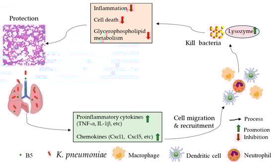 In summary, B5 promoted the rapid recruitment of pulmonary macrophages and dendritic cells in the early stage of K. pneumoniae infection, down-regulated the levels of TNF-α, IL-1β, and IL-17 in the lungs in the later stage of K. pneumoniae infection, and inhibited the activation of signaling pathways associated with inflammatory response, apoptosis, necrosis, etc. (Figure 11). Importantly, B5 significantly decreased the bacterial load in the lungs and spleen and visibly alleviated pulmonary histopathological damage (Figure 11). Collectively, B5 effectively provided protection against multidrug-resistant K. pneumoniae via ameliorating the excessive inflammatory response. Nonetheless, the mechanism of B5 in regulating inflammatory response and metabolic response needs to be clarified. This study provides a possibility that B5 can be used as an alternative adjuvant drug promoting multidrug-resistant K. pneumoniae clearance and mitigating pulmonary inflammatory damage caused by K. pneumoniae.