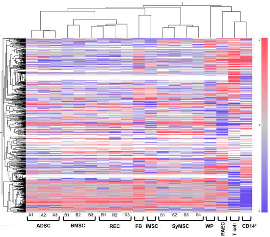 The gene expression data from Amp1200 were used to cluster the following cell types: human SyMSCs, human adipose-derived stem cells (ADSCs), human bone-marrow-derived MSCs (BMSCs), bone-marrow-derived ultra-pure human MSCs (RECs), induced pluripotent stem cell (iPSC)-derived MSCs (iMSCs), human fibroblasts (FBs), human pulmonary artery endothelial cells (PAECs), human white preadipocytes (WPs), human T cells (T cells), and human monocytes (CD14+) (Figure 1). Lot differences among ADSCs, BMSCs, RECs, and SyMSCs were each clustered into a neighborhood and identified as different cell types. The iMSCs were clustered in a neighborhood with FBs and appeared somewhat different from tissue-derived MSCs. CD14+ monocytes, T cells, PAECs, and WPs, which were clearly distinct from MSCs, were clustered separately, whereas FBs were clustered in the vicinity of MSCs.