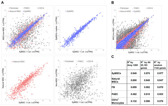 Scatterplot analysis of gene expression in SyMSCs and other cell types. (A) Expression of Amp1200-selected genes in one lot of SyMSCs and other cell types, as indicated. (B) Expression of all 25,193 human genes in one lot of SyMSCs and MSCs/non-MSCs. (C) R2 values between one lot of SyMSCs and the indicated cell types based on expression data from the Amp1200-selected (1143 genes), all-human (25,193 genes), and random-human (1143 genes) gene sets.