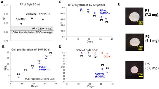 Data of SyMSC-t. (A) R2 values in SyMSC-t. The criteria, 0.809 ± 0.020, for distinguishing SyMSCs from other tissue-derived MSCs are highlighted. (B) Cell proliferation of SyMSC-t1 cultured to P5 (35 days). (C) R2 values in SyMSC-t1 at P1–P5. (D) FCM analysis of CD29 and CD140b (PDGFb) expression in SyMSC-t1 at P1–P5. (E) Representative images of cartilage matrix production in the chondrogenic differentiation of SyMSC-t1 at P1, P3, and P5. No image is available because it does not produce a cartilage matrix in the absence of differentiation induction (its weight is less than 0.1 mg).