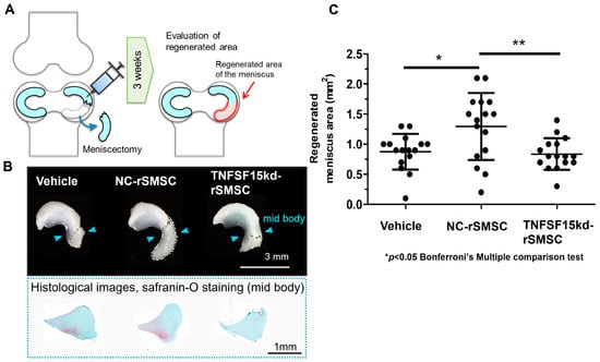 As previously described [26], female rats underwent bilateral knee meniscectomy under isoflurane anesthesia. Female rats were anesthetized with isoflurane. Both the right and left knee joints underwent surgery. A medial parapatellar incision and lateral dislocation of the patellar tendon were conducted to expose the medial meniscus. The anterior insertional ligament of the medial meniscus was transected to dislocate the medial meniscus anteriorly, and the medial meniscus was resected at the level of the medial collateral ligament. The capsule was closed using nylon sutures, and the vehicle (CP-1 High Grade), TNFSF-15kd-rSMSCs, or NC-rSMSCs (1 × 107 cells/50 μL) were injected into the knee joint using a 28G needle. The knee joint was moved three times and the skin was sutured. The time required was approximately 40 min per animal for both knees. Eight rats per condition were used for the knockdown experiments and were allowed to walk freely in their cages after the surgery. Three weeks after the MSC injection, rats were euthanized via exsanguination by cutting the thoracic aorta under isoflurane anesthesia. Then, the knee joint was removed and the medial meniscus was photographed. The regenerated area of the meniscus was measured with ImageJ (1.54 g, National Institutes of Health, Bethesda, MD, USA).