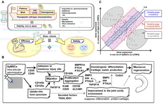 Conceptual design of a two-pronged QC method for cell-therapy products using SyMSCs as a model. (A) Schematic diagram of QC concepts important in the development cell-therapy products. (B) Summary of molecules involved in the hypothesized MoA of SyMSCs in meniscus regeneration. Solid arrows indicate mechanisms with a high degree of certainty based on cited references, while dotted arrows indicate mechanisms with a low degree of certainty that include speculation. (C) Scatterplot of gene expression in SyMSCs and a variety of other cell types to illustrate simultaneous monitoring of many molecules correlated with a cell-therapy product.