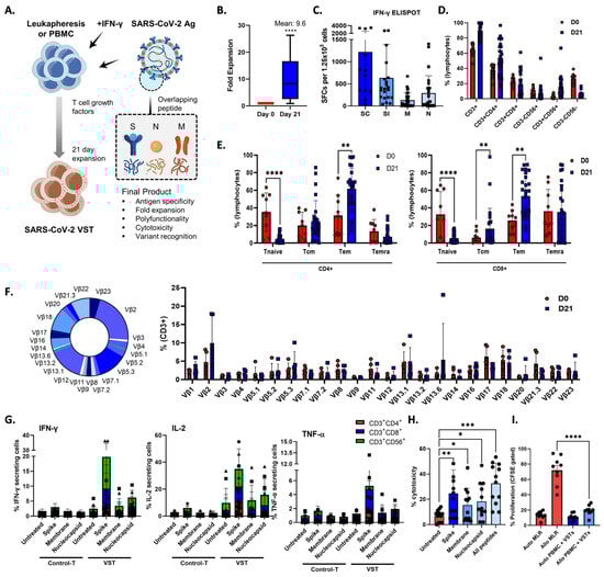 Enhancing SARS-CoV-2-specific T-cell (VST) responses for adoptive immunotherapy: phenotypic characterization and TCR diversity. (A) Representation of the 21-day VST expansion process, where PBMC or leukapheresis samples were stimulated with S, M, and N peptide pools. (B) Post-expansion fold increase in total cell count. (C) Post-expansion VST response against SARS-CoV-2 antigens. (D) Phenotypic distribution of expanded cell population, showing predominance of CD3+ T cells, with helper (CD3+CD4+), cytotoxic (CD3+CD8+), and NKT (CD3+CD56+) cell subsets. (E) Expression levels of T-cell memory markers, including central memory (CD45RA−/CD62L+), effector memory (CD45RA−/CD62L−), terminally differentiated effector memory (CD45RA+/CD62L−), and naïve markers (CD45RA+/CD62L+). (F) Multichannel flow-cytometric analysis of TCR vβ repertoire diversity in expanded cells, capturing >70% of all vβ chains and confirming the presence of all measurable vβ family members; representative donor (left) and summary data are shown as means ± SEMs (right). (G) Intracellular cytokine staining depicting antigen-specific IFNγ, IL-2, and TNF-α production in CD3+CD4+, CD3+CD8+, and CD3+CD56+ T-cell subsets in response to spike (S), nucleocapsid (N), and membrane (M) antigens. Minimal response in the absence of peptide stimulation underscores VST-activation specificity against SARS-CoV-2. Data are shown as SFC ± standard error of mean (SEM). (H) VST cytolytic activity toward carboxyfluorescein succinimidyl (CFSE)-labeled SARS-CoV-2 peptide-loaded autologous phytohemagglutinin-activated (PHA) blasts. Results show targeted lysis at an effector–target ratio of 50:1. (I) HLA-mismatched allogenic PBMC experiments confirm the absence of nonspecific autotargeting and alloreactivity that could lead to graft-versus-host disease; * p < 0.05; ** p < 0.01; *** p < 0.001; **** p < 0.0001. Scale and error bars indicate median and range, respectively. IFNγ: interferon gamma; M: membrane; N: nucleocapsid; PBMC: peripheral blood mononuclear cells; S: spike; SARS-CoV-2: severe acute respiratory syndrome coronavirus-2; SC: spike complete, SFC: spot-forming cell; SI, spike immunodominant; Tem: effector memory T cells; Tcm: central memory T cells; Temra: terminally differentiated effector memory T cells; TCR: T-cell receptor; VST: virus-specific T cell.