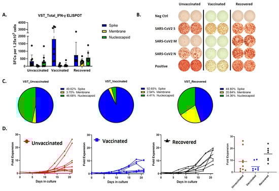 Comparative analysis of VST production and proliferation responses to viral peptides among groups based on SARS-CoV-2 exposure and vaccination status. (A,B) Evaluation of IFN-γ ELISPOT responses to spike, membrane, and nucleocapsid peptides using VSTs produced from donors in groups classified by SARS-CoV-2 exposure and vaccination status: unvaccinated (no prior infection), vaccinated (no prior infection), and recovered (post-infection). (C) IFN-γ response distribution in the unvaccinated group: Spike (49.62%), Nucleocapsid (46.68%), and Membrane (3.7%). IFN-γ response distribution in the vaccinated group: Spike (92.65%). IFN-γ response distribution in the recovered group: Spike (44.8%), Membrane (20.84%), and Nucleocapsid (34.36%). (D) Trends in proliferation rates and fold expansion after 10 and 17 days of incubation. IFN: interferon, SARS-CoV-2: severe acute respiratory syndrome coronavirus 2; VST: virus-specific T cell.