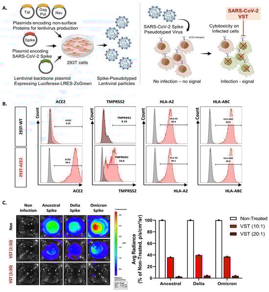 Evaluation of virus-specific T cell (VST) cytolytic capacity across SARS-CoV-2 spike variants. (A) An illustrative overview of the experimental setup and methodology including the generation and infection process of SARS-CoV-2 spike-pseudotyped lentivirus. (B) Flow cytometric characterization, highlighting pronounced expressions of ACE2, TMPRSS2, HLA *A02, and HLA-A/B/C in both HEK293 wild-type (293T-WT) and HEK293T-hACE2-TMPRSS2-mCherry (293T-ACE2) cells. (C) Bioluminescence analysis demonstrating a dose-dependent VST-induced cytotoxic response against cells infected by different variants of SARS-CoV-2 spike-pseudotyped lentiviruses. Induction of bioluminescence through luciferase is indicative of lentiviral infection, and a decrease in bioluminescence signals signifies significant VST-induced cytotoxicity toward the infected target cells. SARS-CoV-2: severe acute respiratory syndrome coronavirus 2.