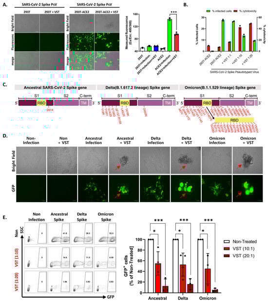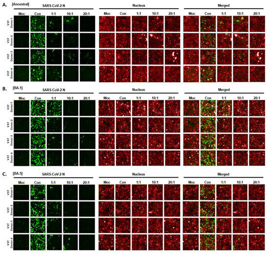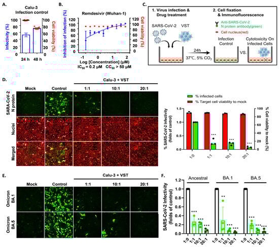To assess the cytotoxic response of VSTs to live SARS-CoV-2, Calu-3 cells were plated at 1.0 × 105 cells per well in 96-well μClear plates (Greiner Bio-One, Kremsmünster, Austria) with Eagle’s Minimum Essential Medium containing 20% fetal bovine serum (FBS), 1× MEM Non-Essential Amino Acids, and 1× antibiotic-antimycotic solution (Gibco, Thermo Fisher Scientific, Waltham, MA, USA), 24 h before infection with ancestral SARS-CoV-2 (NCCP43326) and Omicron subvariants BA.1 (NCCP43408) and BA.5 (NCCP43426). The multiplicities of infection were calibrated for cell viability >90% and virus infectivity >65% at 0.6, 1.0, and 2.6, respectively, for ancestral SARS-CoV-2, Omicron BA.1, and Omicron BA.5. At 24 h post-infection, the cells were fixed with 4% paraformaldehyde and permeabilized with 0.25% Triton-X100. Immunofluorescence staining of the N protein was performed to quantify cell counts and infection rates using Operetta CLS (PerkinElmer) with Harmony software, version 4.8 []. Statistical analysis of VST-induced cytotoxicity was performed using Student’s t-test. Remdesivir was used as a control for antiviral activity, and the results were standardized against mock-infected (0% infection) and negative control (100% infection, treated with 0.5% dimethyl sulfoxide) cells on each assay plate. Data were normalized and analyzed using dose–response curve fitting and confirmed in duplicate, which was supported by the computation of Z’-factor and coefficient of variation. All authentic SARS-CoV-2 procedures were conducted in a BSL-3 laboratory, adhering to safety protocols approved by the Institut Pasteur Korea’s Biosafety Committee (IPKIBC-RA2020-04).
