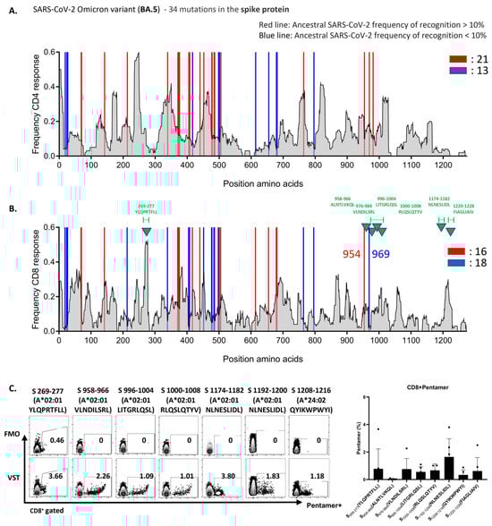 VSTs educated by the ancestral SARS-CoV-2 strain recognize conserved epitopes in the Omicron variant. The expected response frequency for the spike-mutation domain of Omicron BA.5, as inferred from the Immune Epitope Database, emphasizes the maintained high-response frequency even with the 34 present mutations. Analysis of spike-protein epitopes in the Omicron subvariant (BA.5) (A) targeted by CD4+ T cells (conservation rate: 82%), and (B) recognized by CD8+ T cells (conservation rate: 85%). (C) Representative data showcasing the pronounced reactivity of VSTs against seven specific Omicron BA.5 spike-protein immunogenic epitopes (indicated by green triangles in (B)), determined using pentamer analysis. A bar graph consolidates the results from 10 donors. FMO: fluorescence minus one; SARS-CoV-2: severe acute respiratory syndrome coronavirus 2; VST: virus-specific T cell.