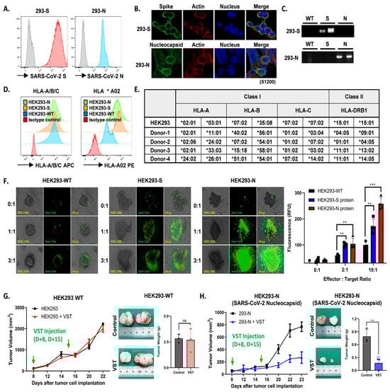 Antigen-specific activation and targeted cytotoxicity toward cells expressing SARS-CoV-2 spike and nucleocapsid proteins. (A) Flow cytometric analyses of SARS-CoV-2 spike (S) and nucleocapsid (N) protein expression in engineered cell lines. (B) Confocal imaging visually confirms S and N protein expressions. (C) Western blotting validates S and N protein expressions. (D) Flow cytometric characterization showing pronounced HLA-A/B/C and HLA *A02 expressions across HEK293 wild-type (WT), HEK293 S, and HEK293 N cells. (E) Effector VSTs from a donor with matching HLA class I allele relative to target 293T cells. (F) Cell Tox Green assay demonstrating increased cytotoxic susceptibility in S protein-expressing HEK293 cells, with cytotoxicity against N protein-transduced HEK293 cells. (G) Post-administration tumor-growth pattern in a xenograft mouse model inoculated with HEK293-WT cells. Green arrows indicate the time points of VST injection. VSTs neither recognize nor exert cytotoxic effects on SARS-CoV-2 antigen-unmodified WT cells, leading to continued tumor growth. (H) With HEK293-N cells expressing the SARS-CoV-2 N protein in the xenograft model, green arrows indicate the time points of VST injection. VSTs exhibit specific recognition and potent cytotoxicity, resulting in significant suppression of tumor growth. ** p < 0.01; *** p < 0.001. HLA: human leukocyte antigen; SARS-CoV-2: severe acute respiratory syndrome coronavirus 2; VST: virus-specific T cell.