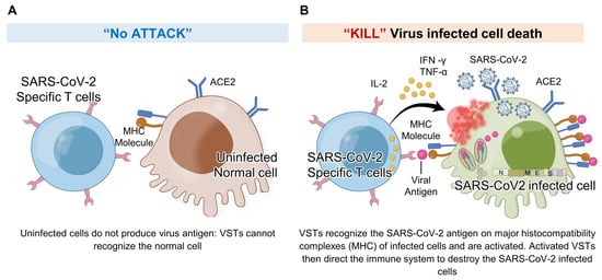 VSTs against SARS-CoV-2 infected cells: In response to SARS-CoV-2 infection, virus-specific T cells (VSTs) specifically target cells including epithelial cells and macrophages that become infected and express the ACE2 receptor. These cells, once infected, process and present viral antigens, which VSTs recognize through TCR-MHC I interactions. This detection triggers VSTs to release cytotoxic granules containing interferon-gamma (IFN-γ) and granzyme B, leading to the effective elimination of the infected cells and impeding the virus’s replication process. Notably, VSTs demonstrate specificity in their response: (A) they do not show cytotoxicity toward normal, uninfected cells, as these do not present SARS-CoV-2 antigens on their surface, and (B) they actively exhibit cytotoxicity against cells expressing virus antigens, thereby effectively inhibiting the viral replication cycle. IL: interleukin; MHC: major histocompatibility complex; SARS-CoV-2: severe acute respiratory syndrome coronavirus 2; TCR: T cell receptor; TNF: tumor necrosis factor.