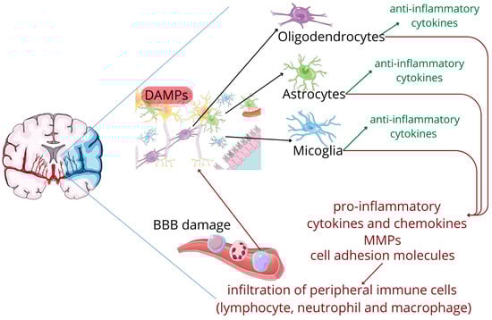 The affected tissue subsequently releases specific molecular signals, known as damage-associated molecular patterns (DAMPs), that set in motion a series of inflammatory cascades involving both innate and adaptive immune systems. Acting as biological alarms, DAMPs activate resident brain immune cells, particularly microglia. Once activated, glia cells adopt both pro-inflammatory and ani-inflammatory phenotypes. The integrity of the blood–brain barrier (BBB), initially compromised by the mechanical effects of the stroke itself, is further aggravated by an array of pro-inflammatory cytokines and chemokines, along with secreted matrix metalloproteinases (MMPs) and upregulated cell adhesion molecules. This disruption allows peripheral immune cells to infiltrate the brain tissue, which further amplify the inflammatory response. This creates a self-perpetuating cycle of neuronal death and immune activation that can extend the initial injury [5,6]; see Figure 1.