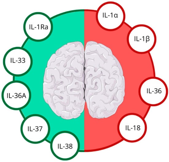 Anti-inflammatory (green half) and pro-inflammatory (red half) IL-1 family cytokines in ischemic stroke. Figure abbreviations: IL-1α—interleukin-1α, IL-1β—interleukin-1β, IL-1Ra—interleukin-1 receptor antagonist, IL-18—interleukin-18, IL-33—interleukin-33, IL-36—interleukin-36, IL-36Ra—interleukin-36 receptor antagonist, IL-37—interleukin-37, IL-38—interleukin-38.