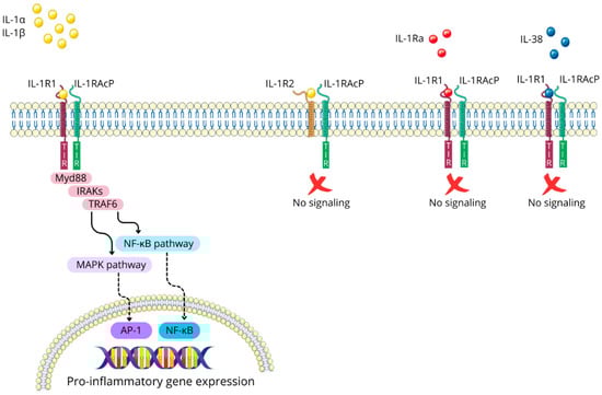 The IL-1 signaling pathway and its regulatory mechanisms. Figure abbreviations: AP-1—activator protein 1; IL-1α—interleukin-1α; IL-1β—interleukin-1β; IL-1R1—interleukin-1 receptor type 1; IL-1Ra—interleukin 1 receptor antagonist; IL-1RAcP—interleukin-1 receptor accessory protein; IL-1R2—interleukin-1 receptor type 2; IL-38—interleukin-38; IRAK—interleukin-1 receptor-associated kinases; MAPK—mitogen-activated protein kinases; Myd88—myeloid differentiation primary response protein 88; NF-κB—nuclear factor-kappa B; TIR domain—the toll-interleukin-1 receptor homology domain; TRAF6—tumor necrosis factor receptor associated factor 6.